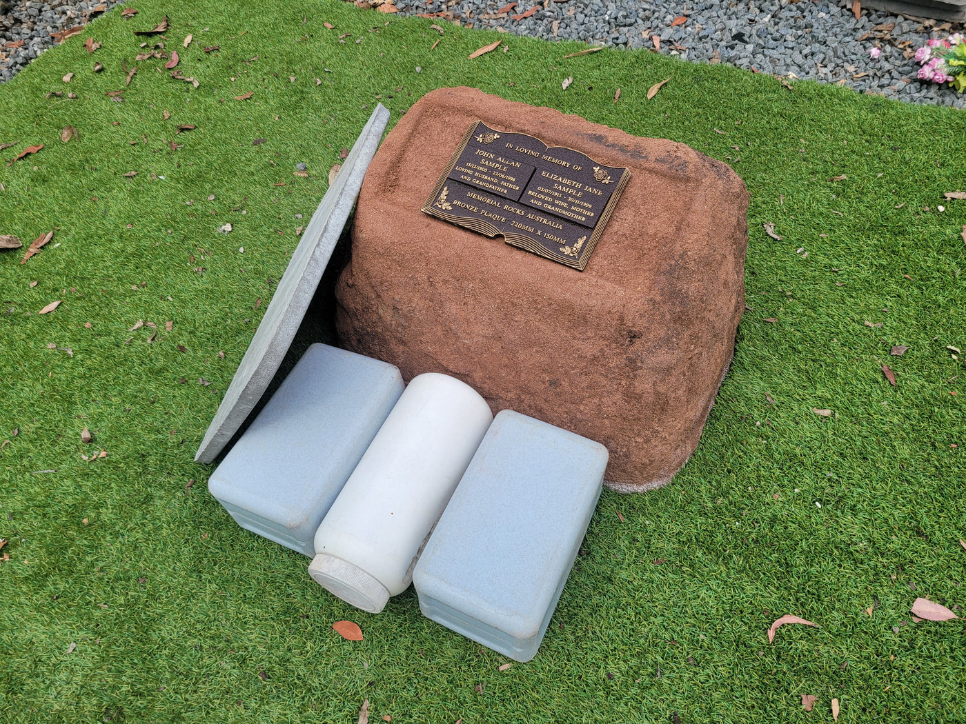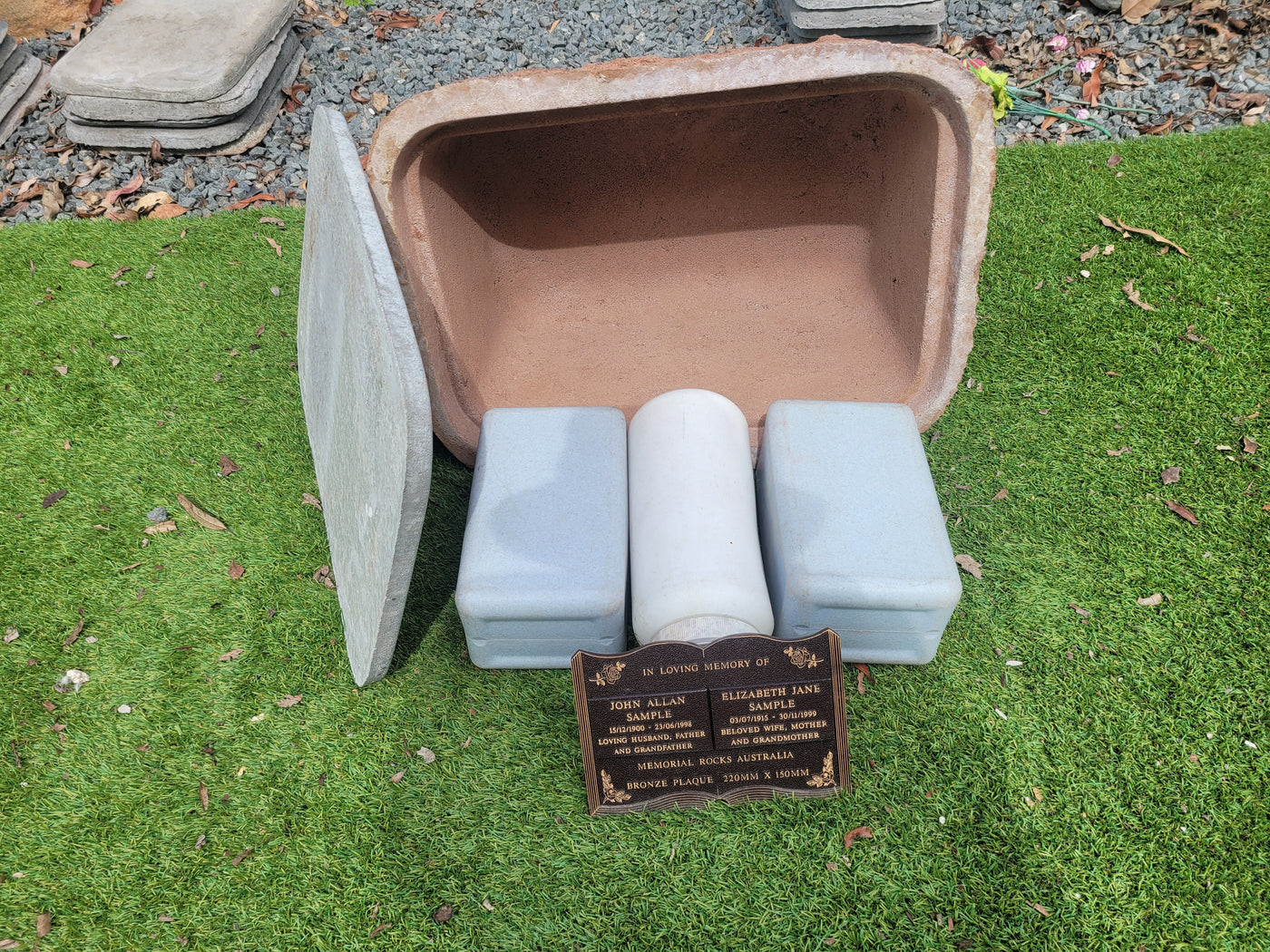 Proudly an original Australian product idea operating since 2009. Extra-Large Size Weight (approx. 30 kg) Memorial Rock/Stone/Urn with a sealable internal cavity for the safe-keeping of a loved one's ashes. Holds one or two or three standard Australian sized ash containers (as demonstrated in photos), plus memorabilia. Size Approx. 600mm x 440...