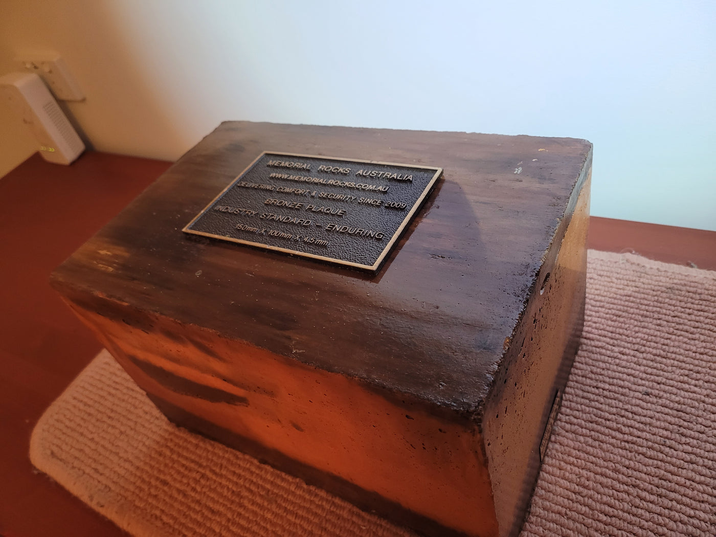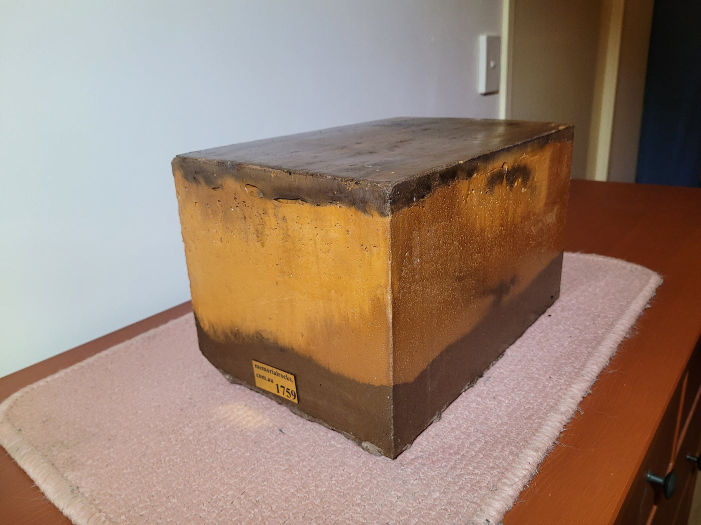 {"id":7799252549821,"title":"Indoor \/ Outdoor Memorial Urn for ashes no. 1759","handle":"indoor-outdoor-memorial-urn-for-ashes-no-1759","description":"\u003cp\u003eGFRC ( Glass Fibre Reinforced Concrete) ( silica free) Indoor\/Outdoor Memorial Urns are a loving practical alternative for the safe keeping of a loved one's ashes.\u003c\/p\u003e\n\u003cp\u003eThe individually unique colouring is not painted on but rather is impregnated as a part of the concrete. A high strength Outdoor quality sealant is then applied. \u003c\/p\u003e\n\u003cp\u003eUnlike the expensive wooden Urns often sold these extremely strong Concrete Urns are very fire resistant.\u003c\/p\u003e\n\u003cp\u003eMultiple Indoor\/ Outdoor Urns can also be stacked forming a Family Memorial Wall.\u003c\/p\u003e\n\u003cp\u003eThis Memorial Urn can accommodate a recommended 150mm x 100mm x4.5mm industry standard bronze plaque. Rectangular or Heart Shaped. \u003c\/p\u003e\n\u003cp\u003ePLAQUE SOLD SEPARATELY \u003c\/p\u003e\n\u003cp\u003eProudly an Australian made, original product. Operating since 2009.\u003c\/p\u003e\n\u003cp\u003eRegular size.\u003c\/p\u003e\n\u003cp\u003eLightweight (approx. 15 kg) Memorial indoor\/outdoor Urn with a sealable internal cavity for the safe-keeping of a loved one's ashes. Holds one standard Australian sized ash container. (250mm x 150mm x 120mm)\u003c\/p\u003e\n\u003cp\u003eA concrete backing plate and adhesive are supplied.\u003c\/p\u003e\n\u003cp\u003eSize External : 320mm x 220mm x 180mm. Internal : 270mm x 160mm x 140mm \u003c\/p\u003e\n\u003cp\u003eA high quality bronze plaque of your choice can also be purchased and can affixed prior to shipping if you wish. A 150mm x 100mm x 4.5 mm Plaque Rectangular or Heart Shaped) is the correct size plaque for the regular sized Indoor \/ Outdoor Memorial Urn.\u003c\/p\u003e\n\u003cp\u003e GST and Free Australia wide delivery is included .\u003c\/p\u003e\n\u003cp\u003e\u003cspan\u003eThe blue plastic cremation urn is photographed for display purposes and to reassure customers that the standard sized Australian cremation urn will fit comfortably.\u003c\/span\u003e\u003c\/p\u003e\n\u003cp\u003ePlease call 0413770272 to arrange to visit our Gold Coast display if you wish to view our full range personally.\u003c\/p\u003e\n\u003cp\u003eIf you have difficulties with local transport, a sample display may be able to come to you.\u003c\/p\u003e\n\u003cp\u003eWe are also able to receive and inter a loved one's ashes if you wish. \u003c\/p\u003e\n\u003cp\u003ePlease contact us any time if You have any questions. \u003c\/p\u003e\n\u003cp\u003eCovit 19 protocols are in place.\u003c\/p\u003e\n\u003cp\u003eWe hope our Indoor \/ Outdoor Memorial Urn will bring some comfort.\u003c\/p\u003e\n\u003cp\u003eAll the Best, Bud and Shinta Manthey. MRA \u003c\/p\u003e\n\u003cp\u003eNOTE: Payment of order can be made easily and securely with a Credit Card or Paypal. You do not need to join Paypal. For an alternative payment arrangement, please call us.\u003c\/p\u003e\n\u003cp\u003eTo buy, simply click \"Add to Cart\".\u003c\/p\u003e\n\u003cp\u003eTo see order, click \"View Cart\", then to pay click \"Check out\".\u003c\/p\u003e\n\u003cp\u003ePayment can be made in 4 installments by using the \" Afterpay \" facility. \u003c\/p\u003e\n\u003cp\u003eFor assistance please call Bud on 0413 770 272.\u003c\/p\u003e\n\u003cdiv\u003e\u003c\/div\u003e","published_at":"2024-06-07T18:40:27+10:00","created_at":"2024-06-07T18:40:28+10:00","vendor":"MRA","type":"Memorial Rock","tags":["ash interment","box urn","casket","concrete box urn","concrete capsule","concrete cremation urn","concrete urn","concrete vault","cremation urn for buffet","cremation urn for home","cremation urn for home furnishing","cremation urn for interior design","Garden Urn Urn of remembrance","home decor","indoor unrs","Indoor Urn for ashes","indoor urns","keepsake","memorial rock","memorial stone","Memorial Stone for Garden","Memorial Stone Plaque","Memorial Stones For Gardens","Memorial Urn","personalised gift for loved ones","Pet Memorial Rock","Remembrance","small memorial rock urn","Stone of Remembrace","Urn","urn for ashes","Urns","urns for buffet","vault","Vaults"],"price":50000,"price_min":50000,"price_max":50000,"available":true,"price_varies":false,"compare_at_price":62500,"compare_at_price_min":62500,"compare_at_price_max":62500,"compare_at_price_varies":false,"variants":[{"id":44057787957437,"title":"Default Title","option1":"Default Title","option2":null,"option3":null,"sku":"1759","requires_shipping":true,"taxable":true,"featured_image":null,"available":true,"name":"Indoor \/ Outdoor Memorial Urn for ashes no. 1759","public_title":null,"options":["Default Title"],"price":50000,"weight":10000,"compare_at_price":62500,"inventory_quantity":1,"inventory_management":"shopify","inventory_policy":"deny","barcode":"","requires_selling_plan":false,"selling_plan_allocations":[]}],"images":["\/\/www.rockurns.com.au\/cdn\/shop\/files\/20240607-181415.jpg?v=1717749884","\/\/www.rockurns.com.au\/cdn\/shop\/files\/20240607-181325.jpg?v=1717749884","\/\/www.rockurns.com.au\/cdn\/shop\/files\/20240607-181322.jpg?v=1717749884","\/\/www.rockurns.com.au\/cdn\/shop\/files\/20240607-181336.jpg?v=1717749884","\/\/www.rockurns.com.au\/cdn\/shop\/files\/20240607-181426.jpg?v=1717749884","\/\/www.rockurns.com.au\/cdn\/shop\/files\/20240607-181011.jpg?v=1717749884","\/\/www.rockurns.com.au\/cdn\/shop\/files\/20240607-180920.jpg?v=1717749884","\/\/www.rockurns.com.au\/cdn\/shop\/files\/20240607-180958.jpg?v=1717749884","\/\/www.rockurns.com.au\/cdn\/shop\/files\/20240607-181044.jpg?v=1717749884","\/\/www.rockurns.com.au\/cdn\/shop\/files\/20240607-181058.jpg?v=1717749884","\/\/www.rockurns.com.au\/cdn\/shop\/files\/20240607-181112.jpg?v=1717749884","\/\/www.rockurns.com.au\/cdn\/shop\/files\/20240607-181353.jpg?v=1717749884","\/\/www.rockurns.com.au\/cdn\/shop\/files\/20240607-181412.jpg?v=1717749884","\/\/www.rockurns.com.au\/cdn\/s