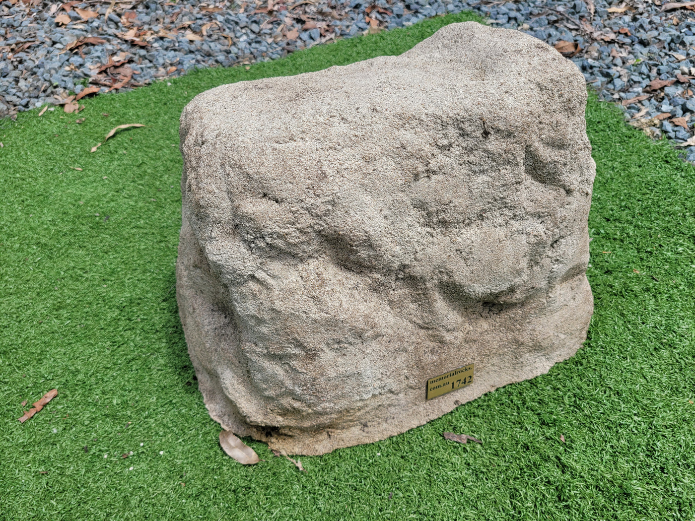 Proudly an original Australian product idea operating since 2009. Large Single Size Approx. 24 kg. Memorial Rock/Stone/Urn with a sealable internal cavity for the safe-keeping of a loved one's ashes. Holds one standard Australian sized ash container, plus memorabilia. Size Approx. 450mm x 390mm x 300mm (external). 270mm x 230mm x 170mm (interna...
