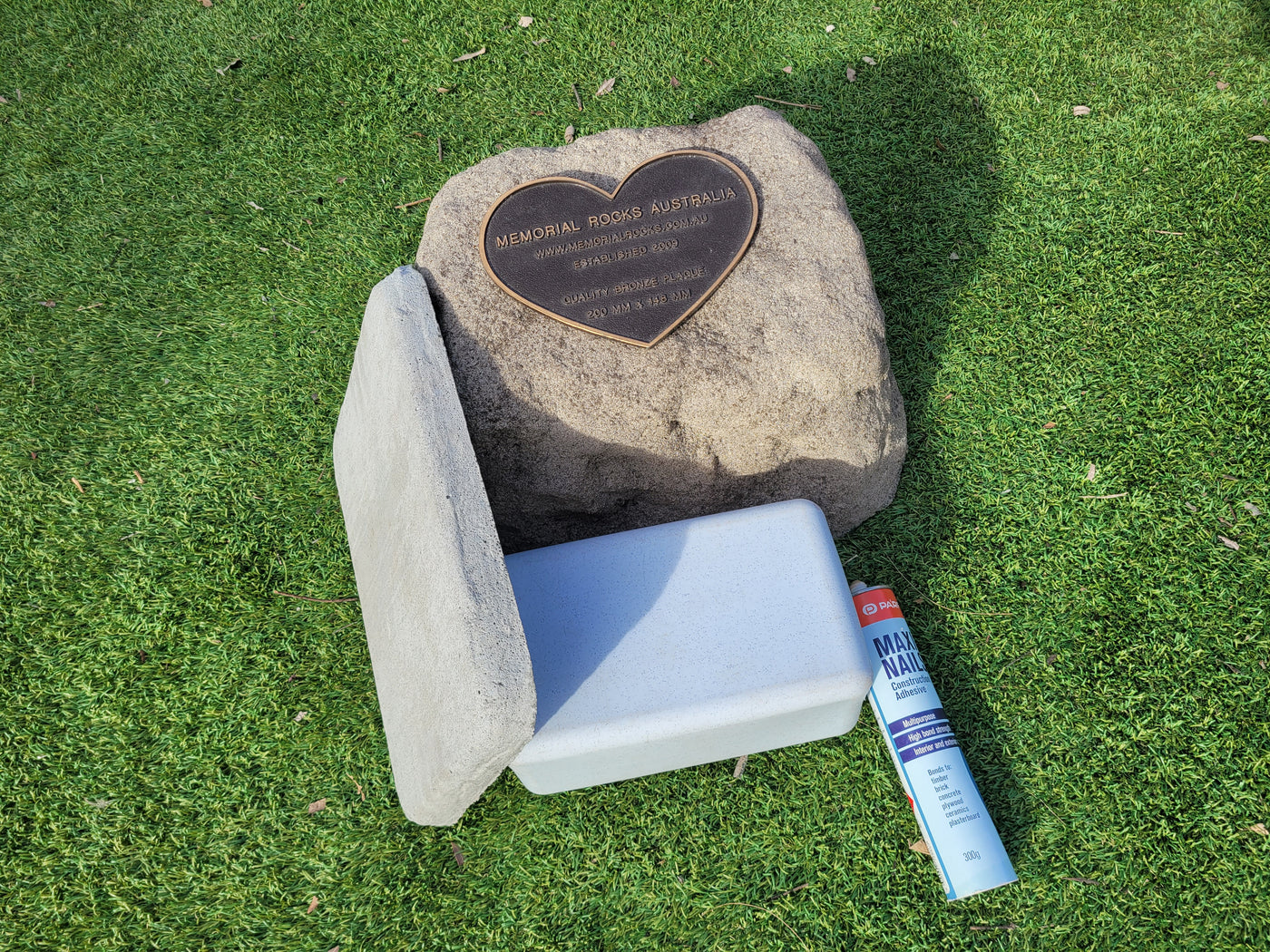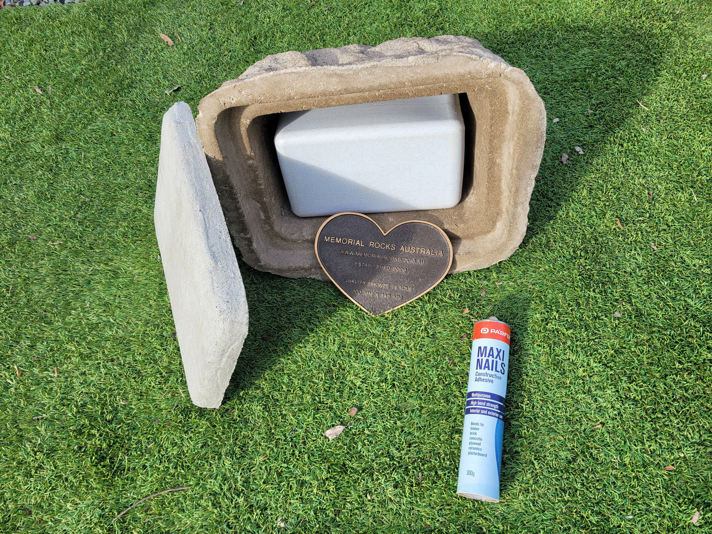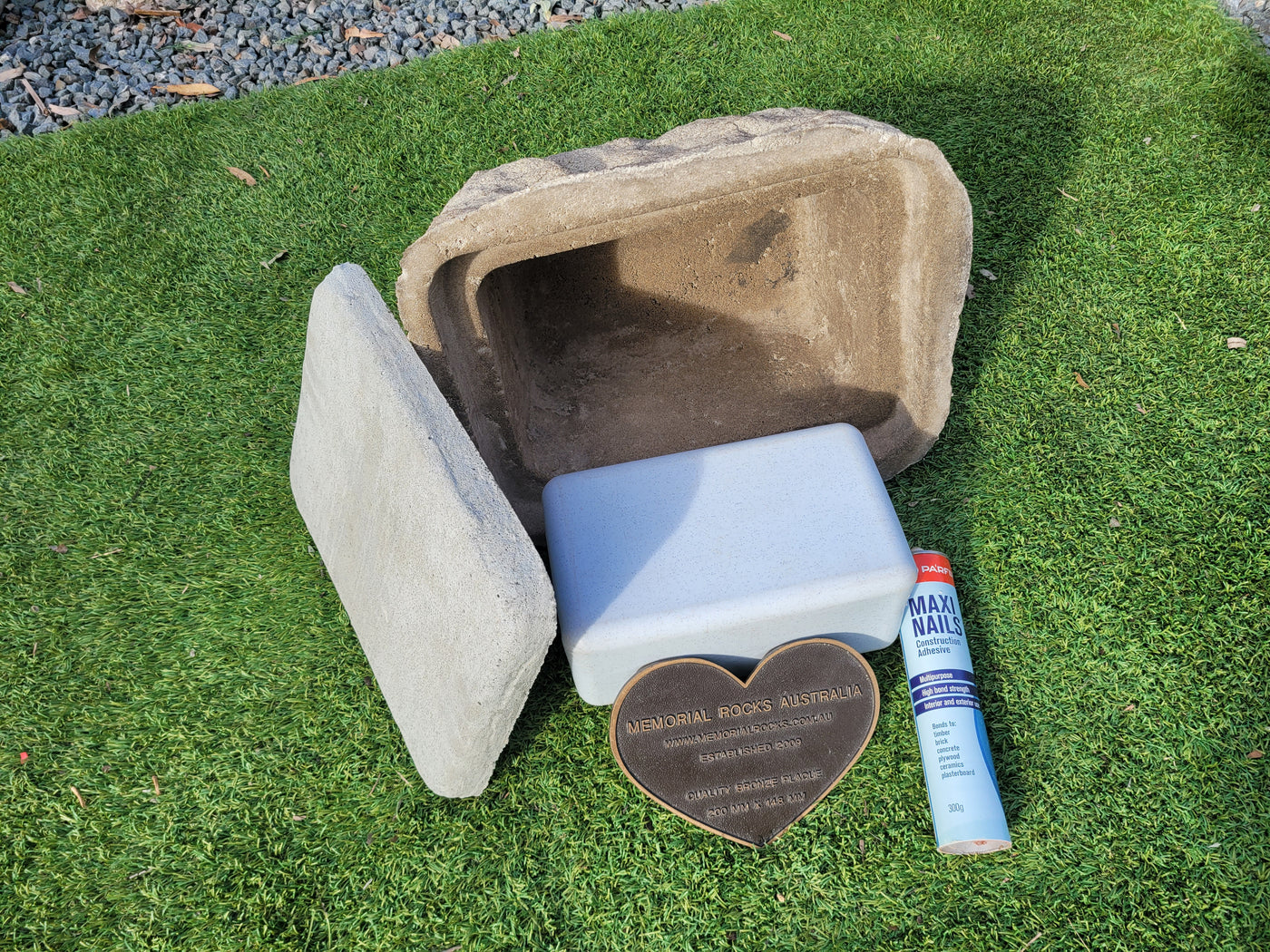 Proudly an original Australian product idea operating since 2009. Large Single Size Approx. 24 kg. Memorial Rock/Stone/Urn with a sealable internal cavity for the safe-keeping of a loved one's ashes. Holds one standard Australian sized ash container, plus memorabilia. Size Approx. 450mm x 390mm x 300mm (external). 270mm x 230mm x 170mm (interna...