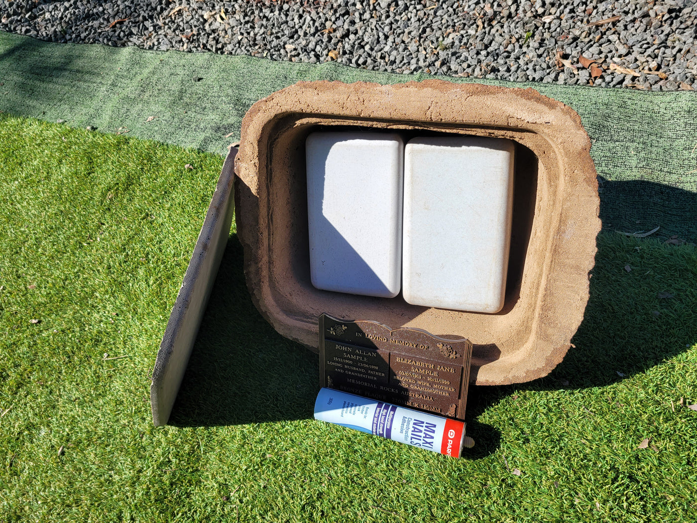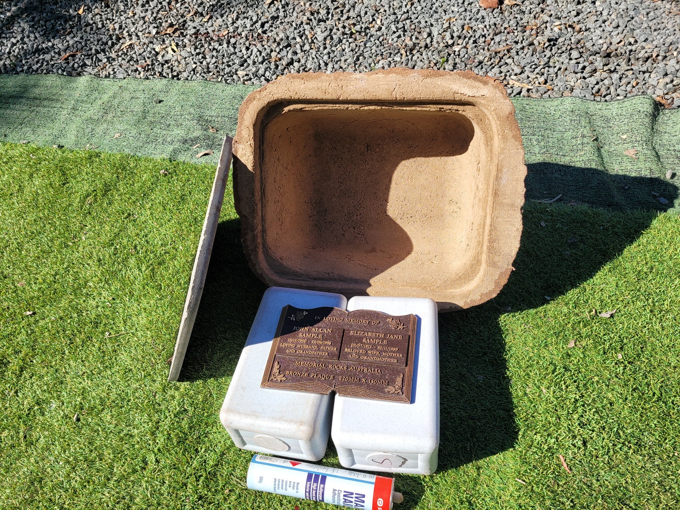 Proudly an original Australian product idea operating since 2009. Large Double Size Weight (approx. 24 kg) Memorial Rock/Stone/Urn with a sealable internal cavity for the safe-keeping of a loved one's ashes. Holds one or two standard Australian sized ash containers, plus memorabilia. Size Approx. 490mm x 410mm x 300mm (external). 320mm x 260mm ...