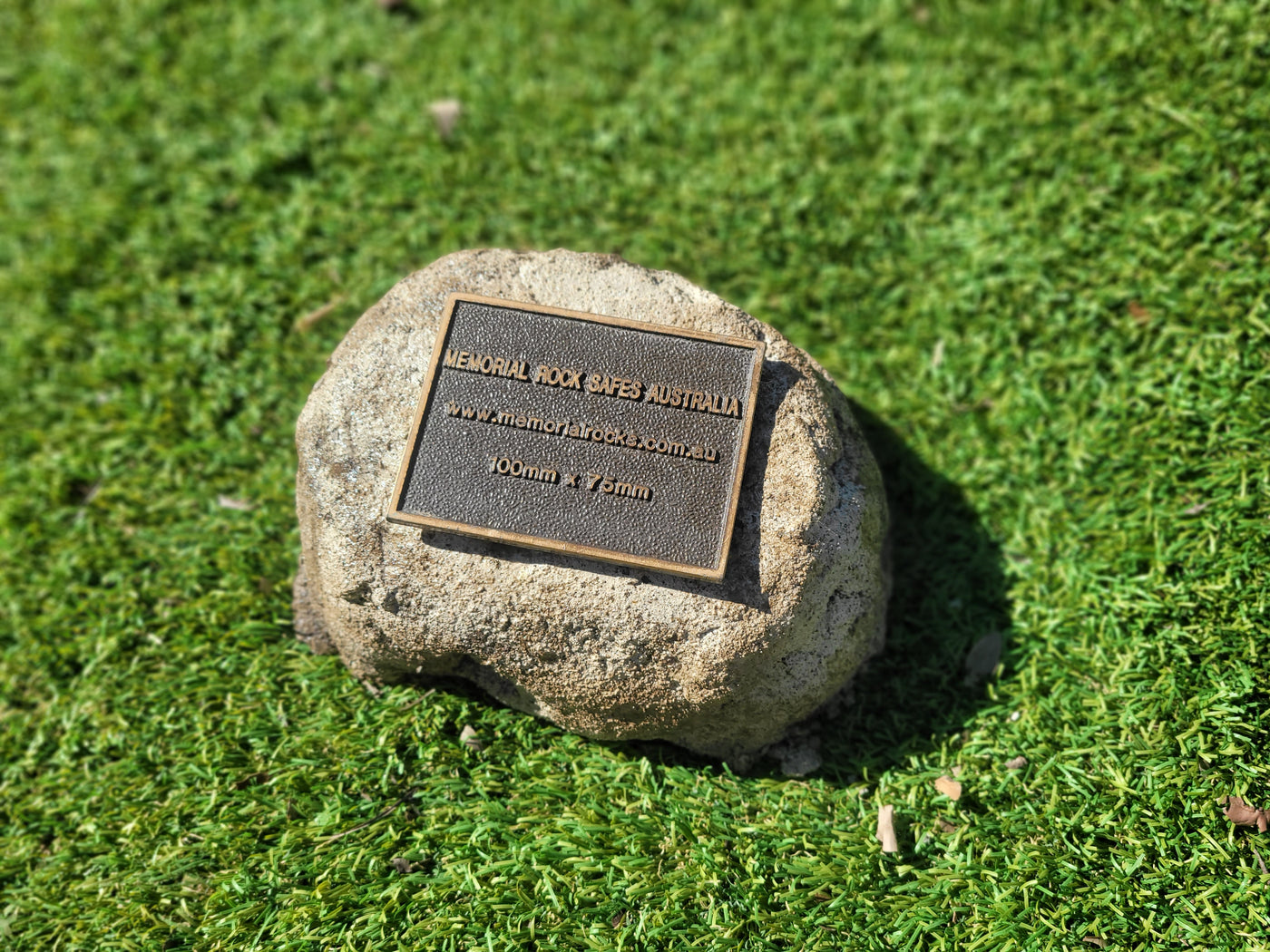 Memorial Rock Urns are a loving practical alternative for the safe keeping of a loved one's ashes. This Memorial Rock Urn has a small internal sealed container for partial ash interment. This Partial Ash Urn Memorial rock has an incorporated flat space for a industry standard bronze plaque 80 mm x 40mm x4.5mm or a 150mm x 100mm x 4.5 mm hear...