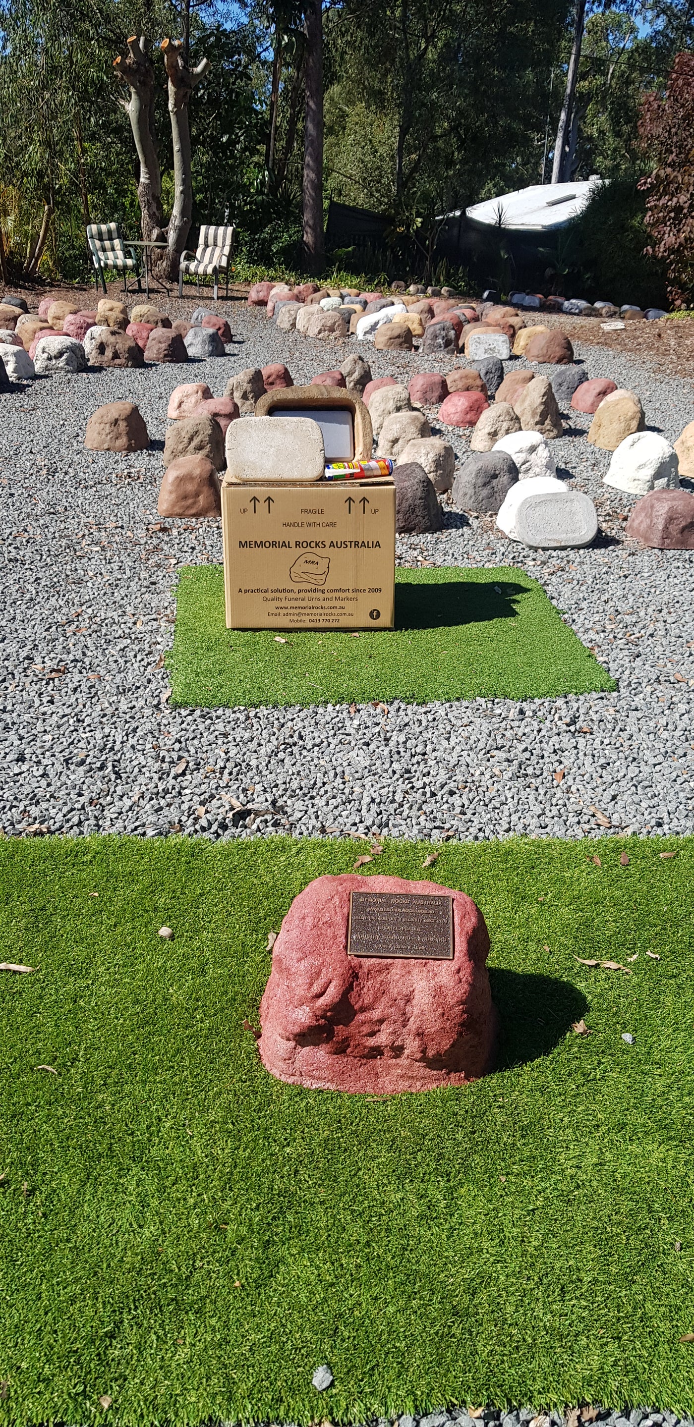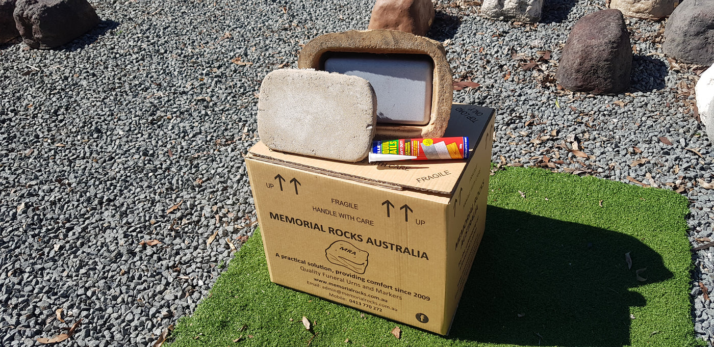 Memorial Rock Urns are a loving practical alternative for the safe keeping of a loved one's ashes. This Memorial rock has an incorporated flat space for a 150mm x 100mm x4.5mm industry standard bronze plaque. PLAQUE SOLD SEPARATELY Proudly an Australian made, original product. Operating since 2009. Regular size. Lightweight (approx. 12 kg) Me...