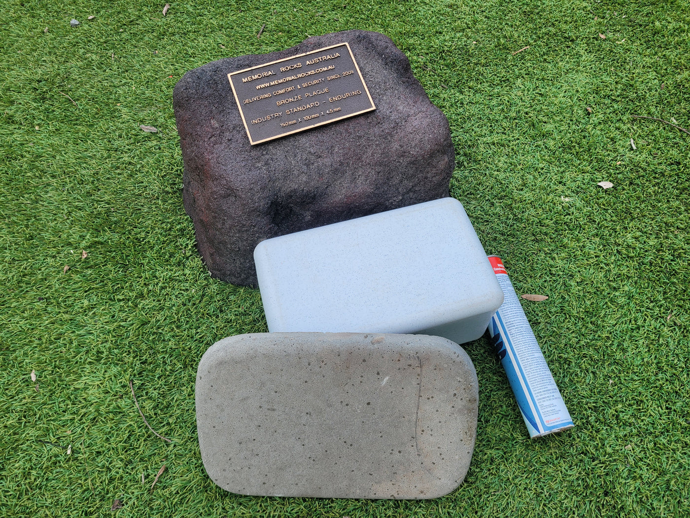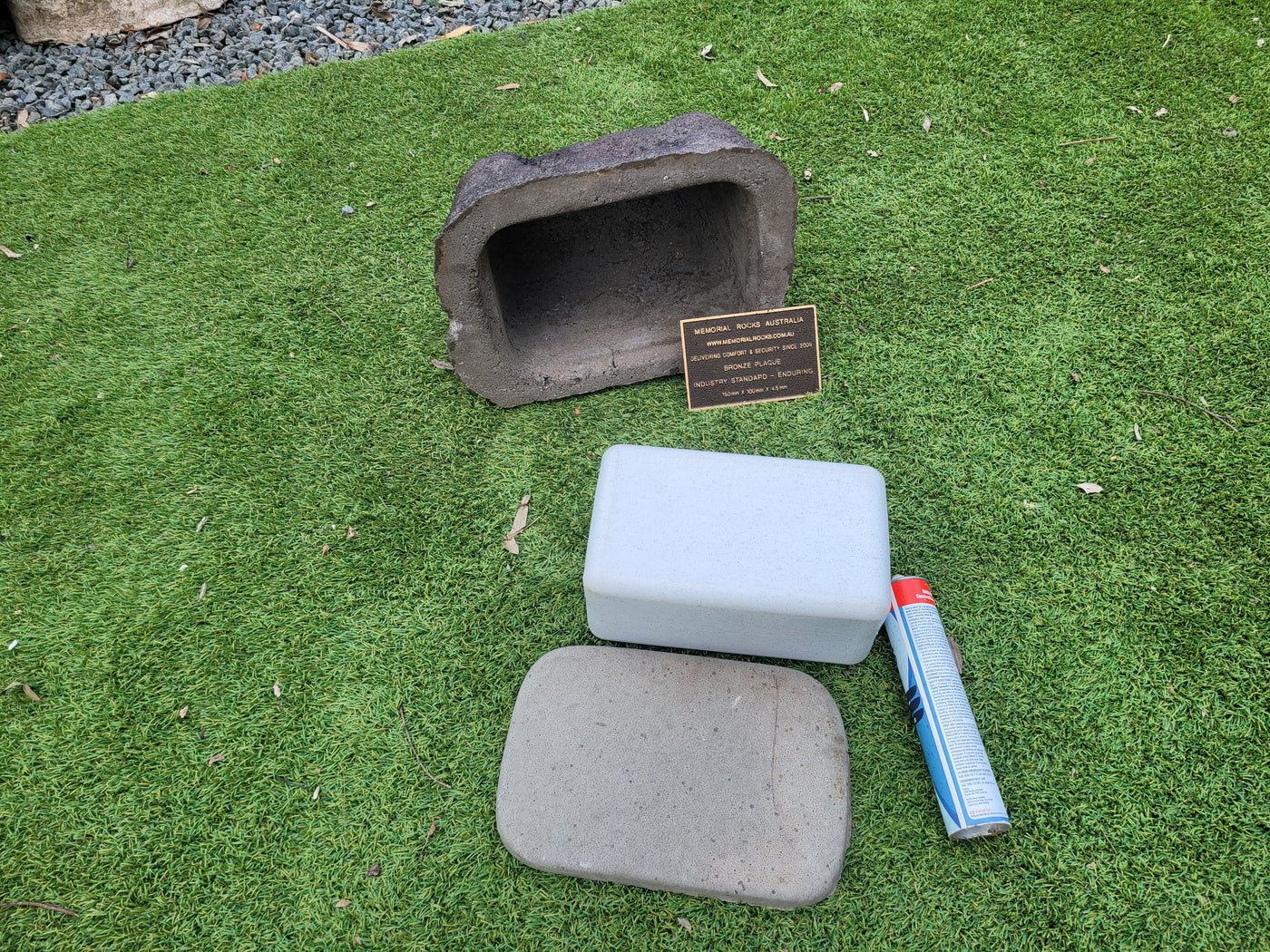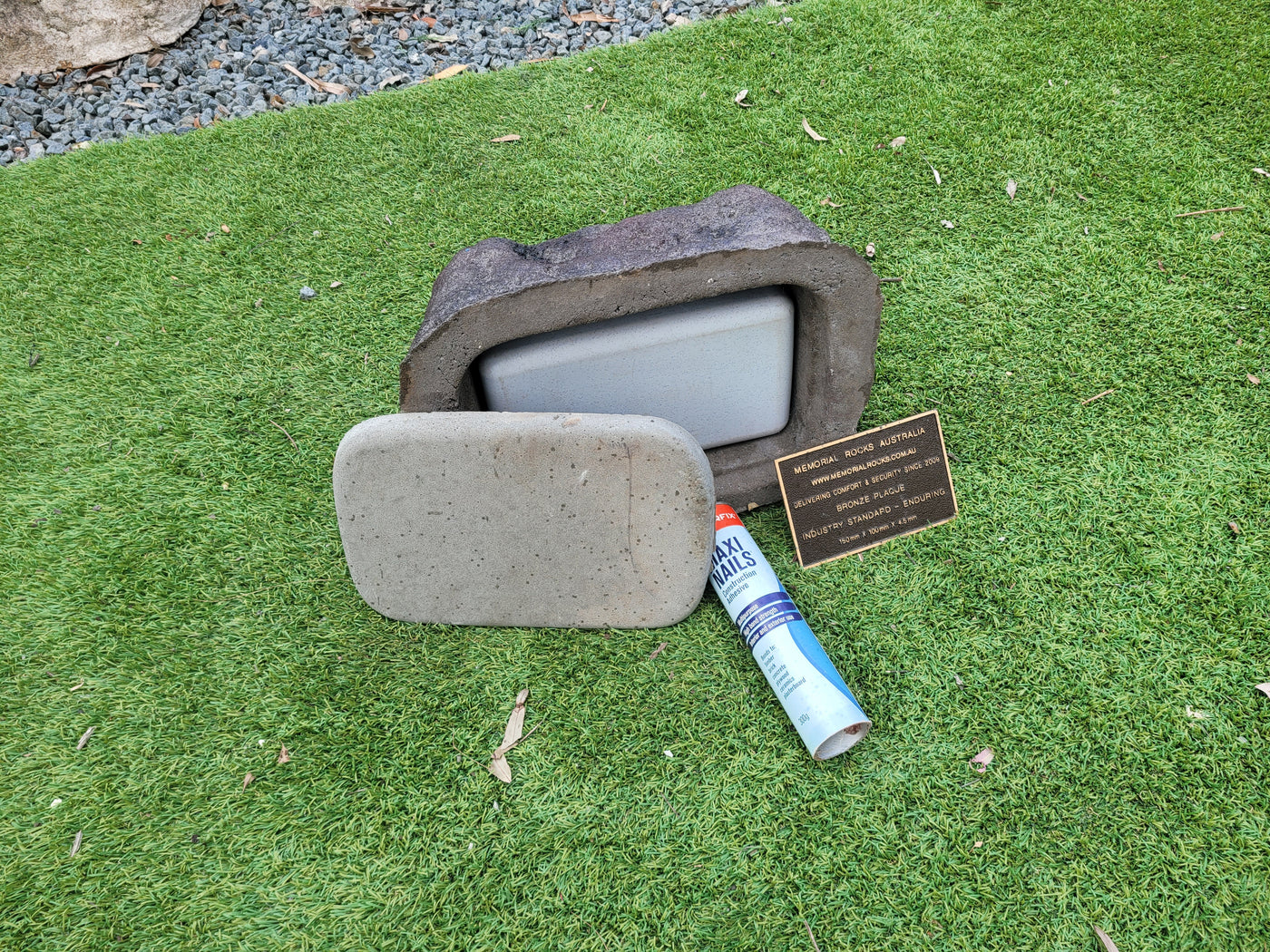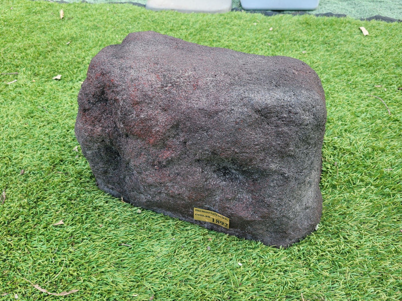 Memorial Rock Urns are a loving practical alternative for the safe keeping of a loved one's ashes. This Memorial rock has an incorporated flat indented recess space for a 150mm x 100mm x4.5mm industry standard bronze plaque. PLAQUE SOLD SEPARATELY Proudly an Australian made, original product. Operating since 2009. Regular size. Lightweight (a...
